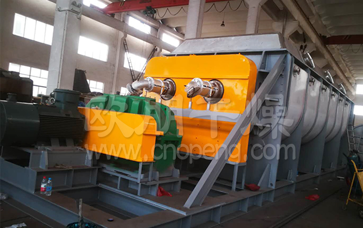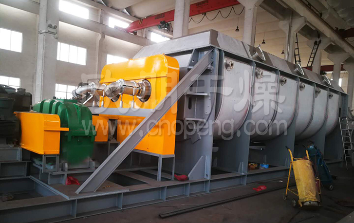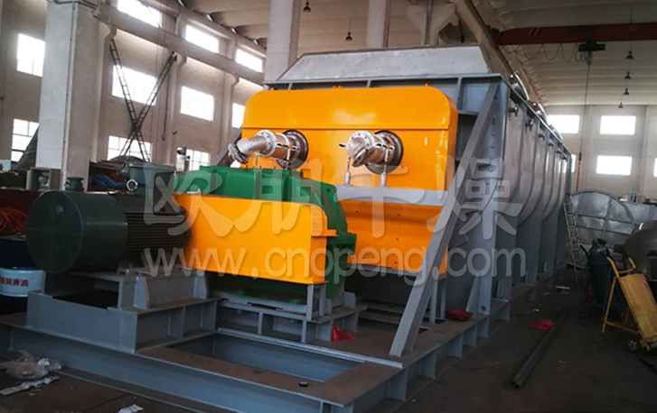 常州欧朋干燥280平方的超大型不锈钢浆叶干燥机是一种以热传导为主的卧式搅拌型连续干燥设备。因搅拌叶片形似船桨,故称桨叶干燥机,国外也称槽型干燥机或搅拌干燥机。因设备干燥所需要的热量依靠热传导间接加热,因此干燥过程不需或只需少量气体以带走湿份。极大地减少了被气流带走的这部分热量损失,提高了热量利用率,是一种节能型干燥设备。 桨叶干燥机广泛应用于石油化工、化工、冶金、食品、医药、农药等行业中粉状、粒状、滤饼状、浆液状物料的干燥。