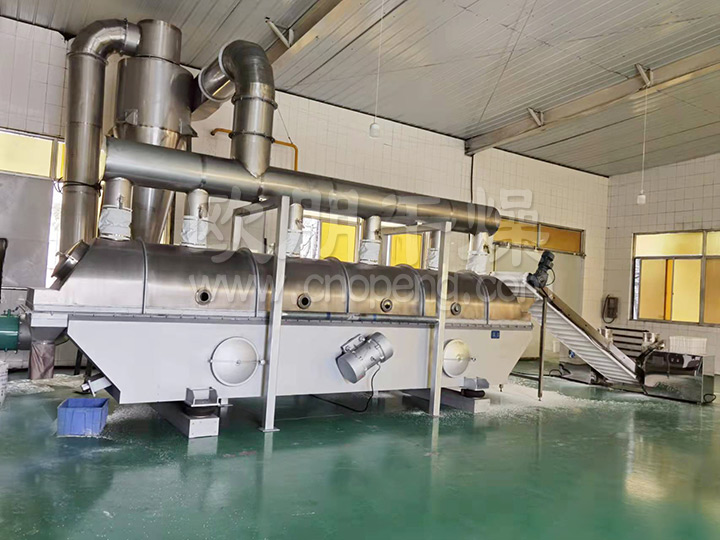 物料自进料进口进入机内,在振动力作用下,物料沿水平面流化床抛掷,向前连续运动,热风向上穿过流化床同湿物料换热后,湿空气经旋风分离器除尘后由排风1:3排出.干燥物料由排料进口排出。